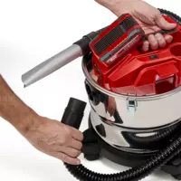 Einhell batteridrevet askesuger TE-AV 18/15 Li C-Solo er en del av Power X-Change-familien og sørger for å holde kakkelovner, vedovner og griller rene. For riktig trekk i ovnen, må den være ren. Det er ikke bare askeskuffen som må tømmes, like viktig er det å gjøre rent i vanskelig tilgjengelige kroker og mellomrom. Filterrengjøringssystemet sørger for at sugeeffekten på 100 mbar opprettholdes. Fint støv og aske har ingen sjanse mot foldefilteret. Ved å flytte slangen kan askesugeren også brukes med blåsefunksjon. Den metallforsterkede sugeslangen og spaltmunnstykke i aluminium gir askesugeren en stabil konstruksjon. Den store 15 liters oppsamlingsbeholderen gjør at man kan arbeide i lang tid, og det er lett å tømme den med hurtiglåsen. Den batteridrevne askesugeren er fleksibel og lett å flytte på med sine fire styreruller. Den er lett å transportere med det praktiske bærehåndtaket, og på toppen av askesugeren kan slangen vikles opp for plassbesparende oppbevaring. Leveres uten batteri og lader, disse må kjøpes separat.